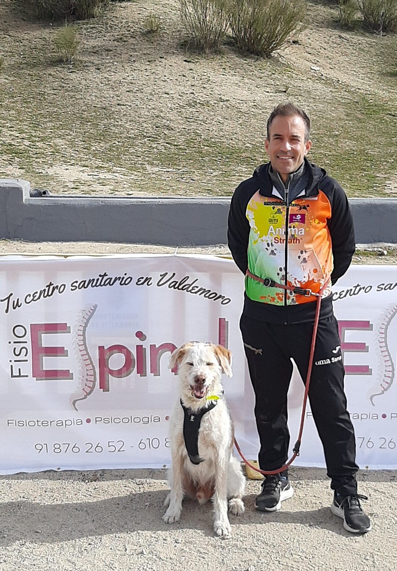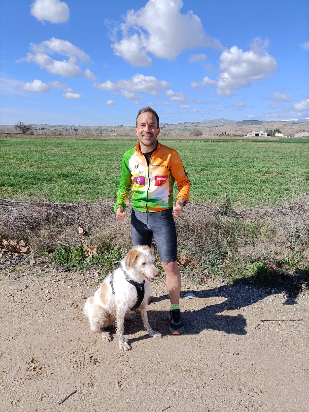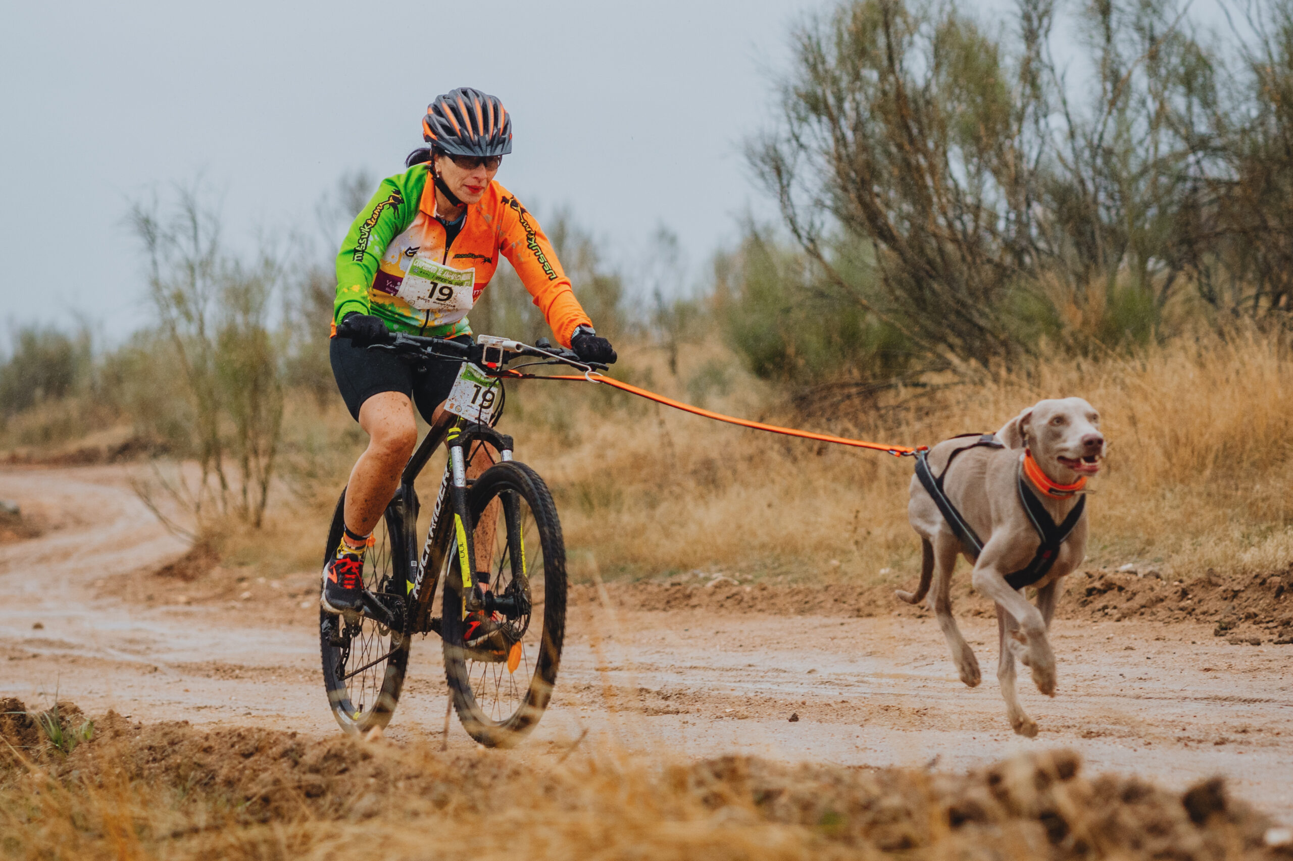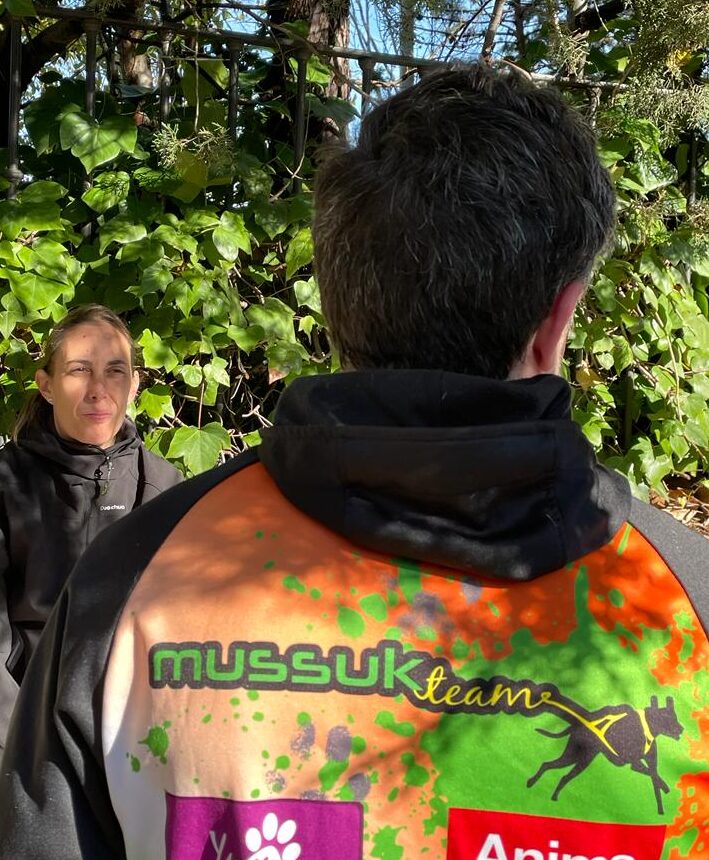 Monica con su maillot del Mussuk Team en la disciplina de Bikejoring junto a CoachVicente luciendo maillot posando con Tomate
